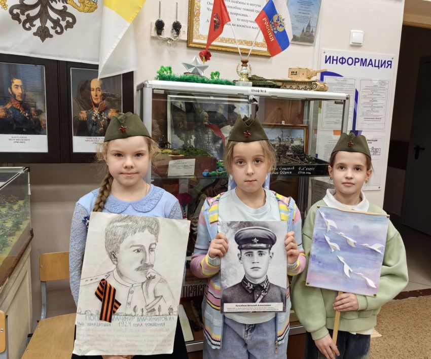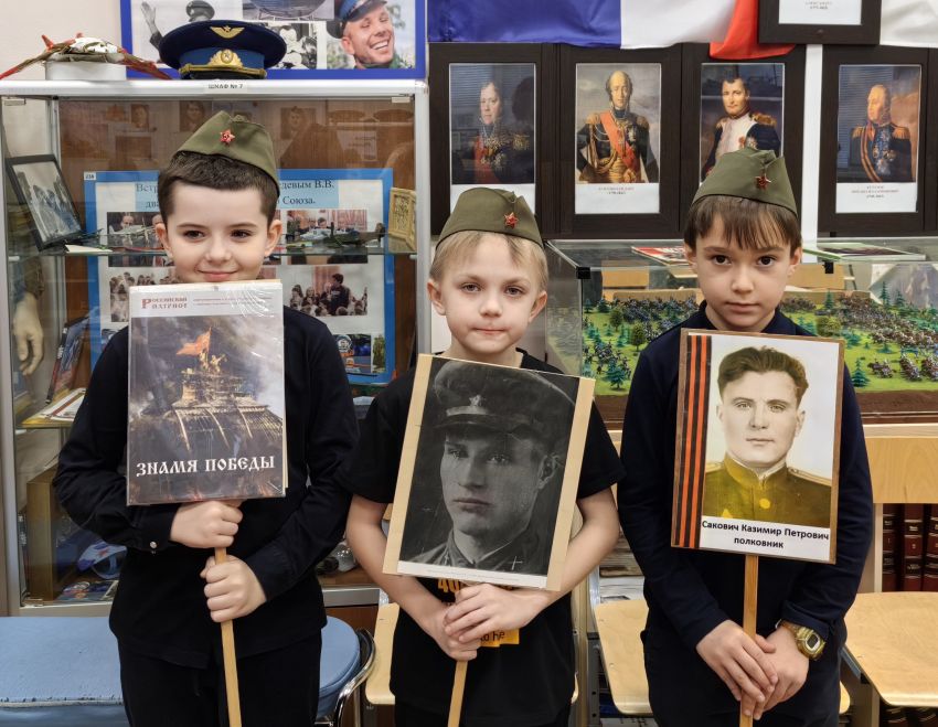 На минувшей неделе в группе продлённого дня прошла фотовыставка «Правнуки Победы». Ученики начальной школы, посещающие ГПД, принесли портреты и рассказали историю своего прадеда-героя, посетив школьный Музей Боевой славы.