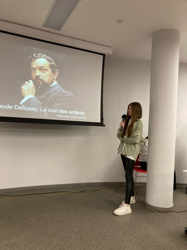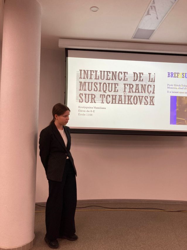 Василиса (ученица 8 «Е» класса) представила вниманию присутствовавших на мероприятии свою презентацию и доклад «Влияние французской культуры на творчество Петра Ильича Чайковского».